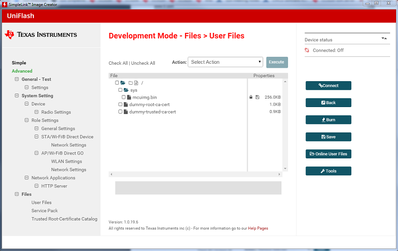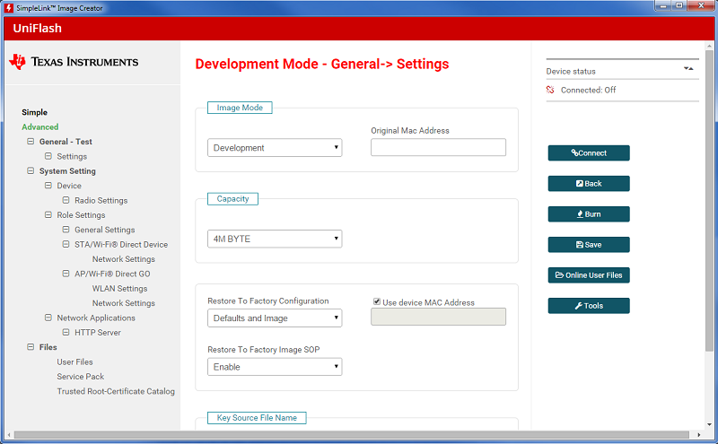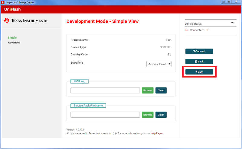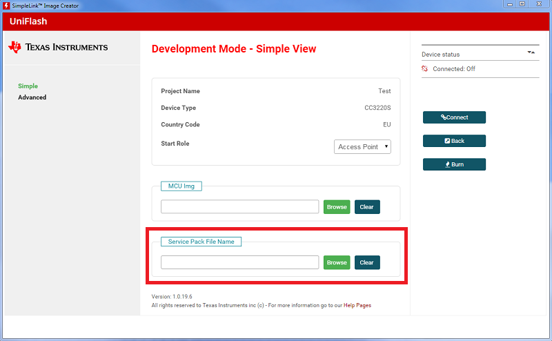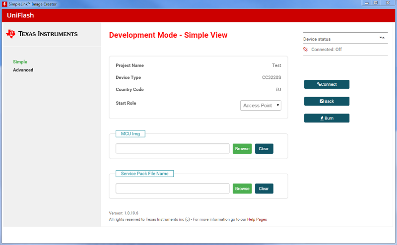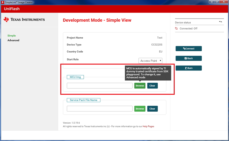When you open up a new project in UniFlash ImageCreator, the first page you see will be the Simple view. This view provides the essentials to flash an application MCU image and a service pack to the SimpleLink Wi-Fi device to get you started in your development.