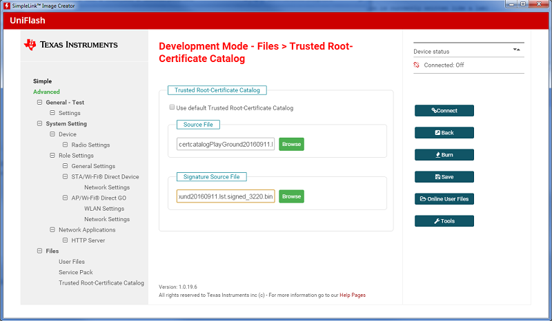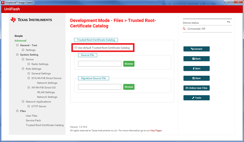 To securely sign the MCU image with your own certificate, switch to the advanced view and refer to the UniFlash ImageCreator User's Guide.