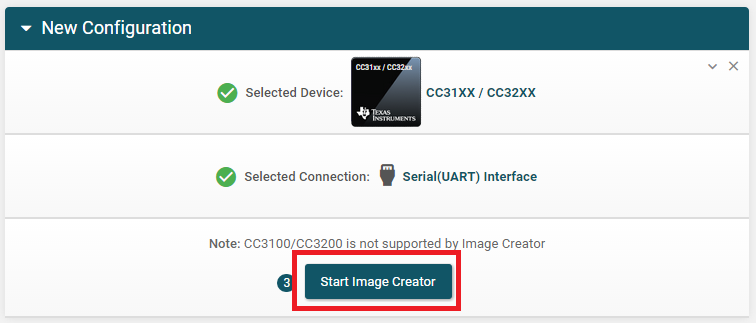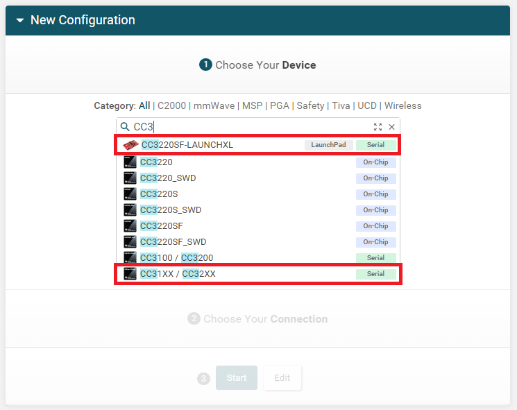Alternatively, you can manually choose your device. Type "CC3" into the search bar and you'll see a number of options. Select the CC3220SF-LAUNCHXL or CC31XX / CC32XX Serial device and click Start Image Creator to launch the ImageCreator tool.