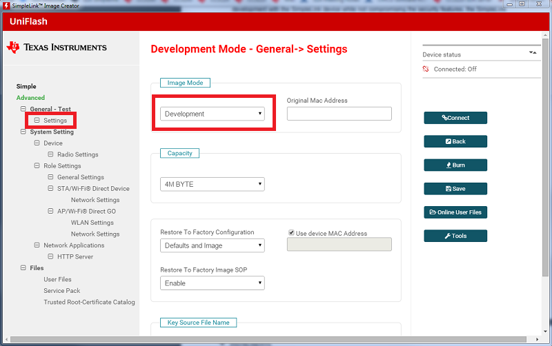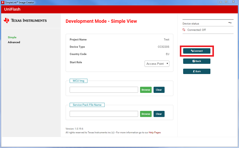 If you have the device in Development mode and you are working with a new LaunchPad, the ImageCreator tool will need to detect the LaunchPad's MAC address so it can successfully program the device. Click the Connect button on the right.