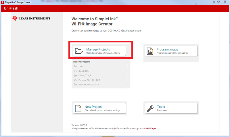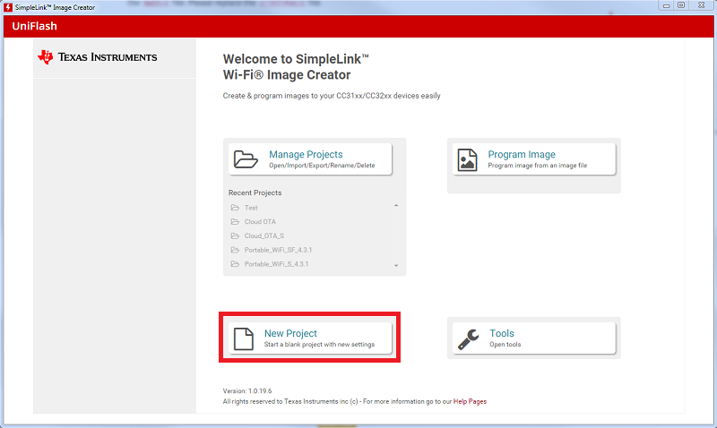 Each ImageCreator project is a workspace for creating an image file for a CC3x20 or CC3x35 device. SimpleLink Wi-Fi devices contain so much more than application code, so different projects allow users to easily develop and test different device configurations, security features, certificates, and user files.