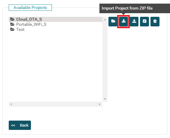 Select Import Project from ZIP file. Other options include Open Selected Project (highlighted in Available Projects list), Export Selected Project (as a ZIP file), Rename Selected Project, and Delete Selected Project.