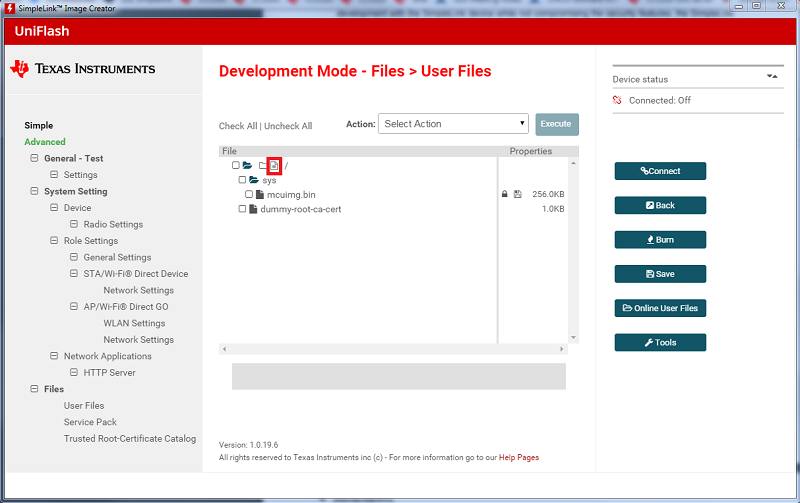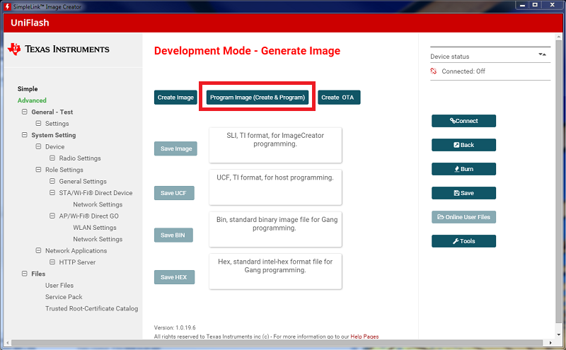 The Burn button on the right will take you to the Generate Image page where you can create and program an image to the device. Select Program Image to generate a project image containing all of your files and configuration settings and load it to the external serial flash for the CC3xxx.