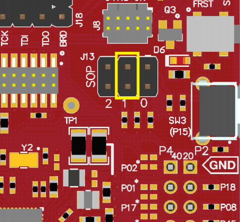 To enable flash programming on the CC32xx LaunchPad, the Sense-On-Power (SOP) jumpers on the board need to be configured correctly. The CC32xx device implements a SOP scheme to determine the device operation mode upon power up. Ensure the SOP jumpers are set to 010, as shown in the image below.