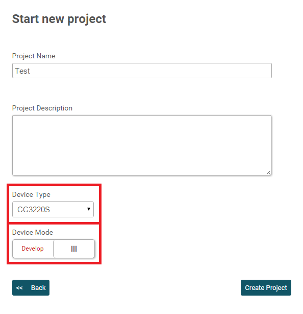 The next screen will ask you to name the project and select a Device Type and Device Mode. Be sure you are selecting the correct device type (CC32xxS, CC32xxSF, CC3220R, or CC31xxR). If you plan to use the LaunchPad's JTAG or debug with Code Composer Studio, you will want to set the Device Mode to Develop. You can change this later. For more details on this mode, see Development vs. Production Mode.