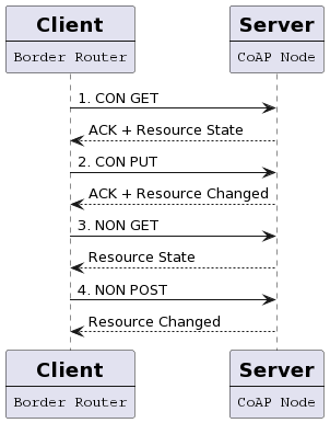 The communication follows a Client-Server-Structure, where the Client can request GET data from the Server or send PUT data to the Server. Depending on the message the Server will respond with the current state of the requested GET resource or it will change PUT the state of the resource. The relation of Client and Server is visualized in the figure below. Border Router and CoAP Node can both act as Server and Client. This means that the Border Router (Client) can send and request data from the CoAP Node (Server) and the CoAP Node (Client) can send and request data from the Border Router (Server). This will be shown in detail by the tasks.