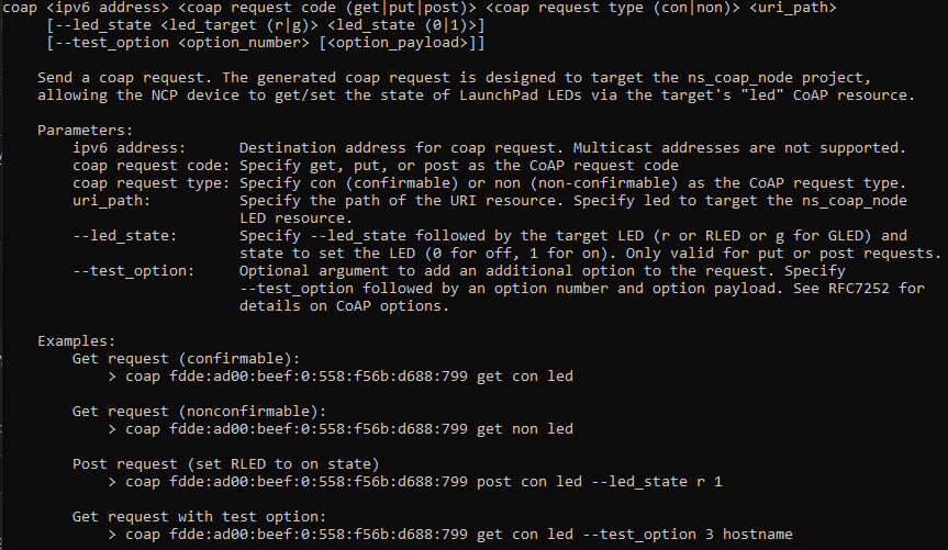 This lab will explain how to use the CoAP application layer for communication over TI Wi-SUN FAN stack. The first task is to setup a Wi-SUN network with a Border Router, Host and a CoAP Node. The second task will be running the out of the box CoAP example, highlighting critical concepts along the way. In the third task, you will extend the CoAP Nodes functionality to send a message to the Border Router and the fourth task will teach you how to send confirmable messages and acknowledgements.