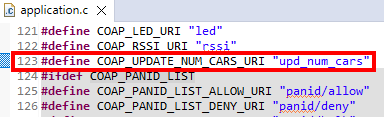 To differentiate between the different CoAP requests the URIs are used. Therefore, you define first a new URI which will be used to sign the request to update the number of plugged in cars. Insert the code in the define section in the beginning where also the