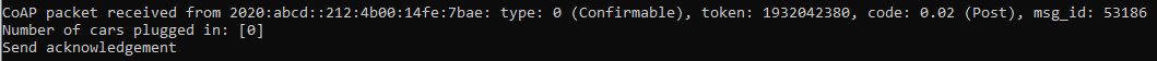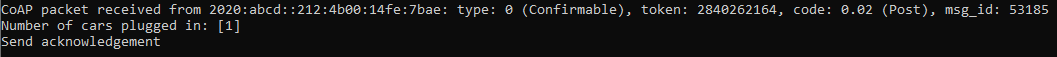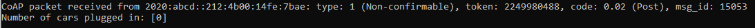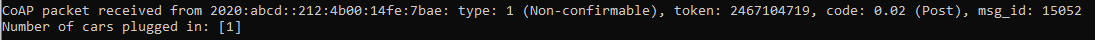 Following the example use case a new car was now plugged in and the CoAP Node notified the Border Router with a CoAP request message. The Host registered the message and handled it with the print message.