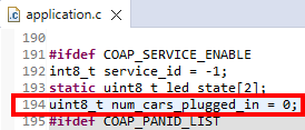 Next you have to add a new global variable to count the number of plugged in cars. Insert the code at the top into the CoAP global variable section where the