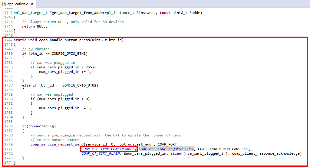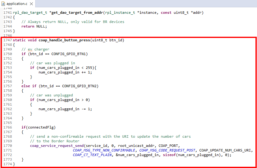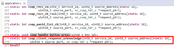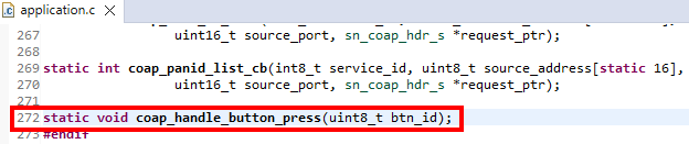 Finally, you need to add the function definition of the CoAP button press handling function. The code has to be inserted at the end of the file.
