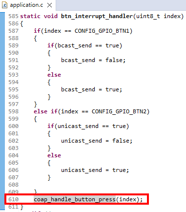 When a button is pressed, the button interrupt handler is executed. To send a CoAP message when the button is pressed, you need to add a function call to our previously defined handling function in the function