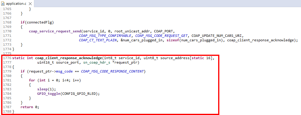 static int coap_client_response_acknowledge(int8_t service_id, uint8_t source_address[static 16], uint16_t source_port, sn_coap_hdr_s *request_ptr) { if (request_ptr->msg_code == COAP_MSG_CODE_RESPONSE_CONTENT) { for (int i = 0; i<4; i++) { sleep(1); GPIO_toggle(CONFIG_GPIO_RLED); } } return 0; }