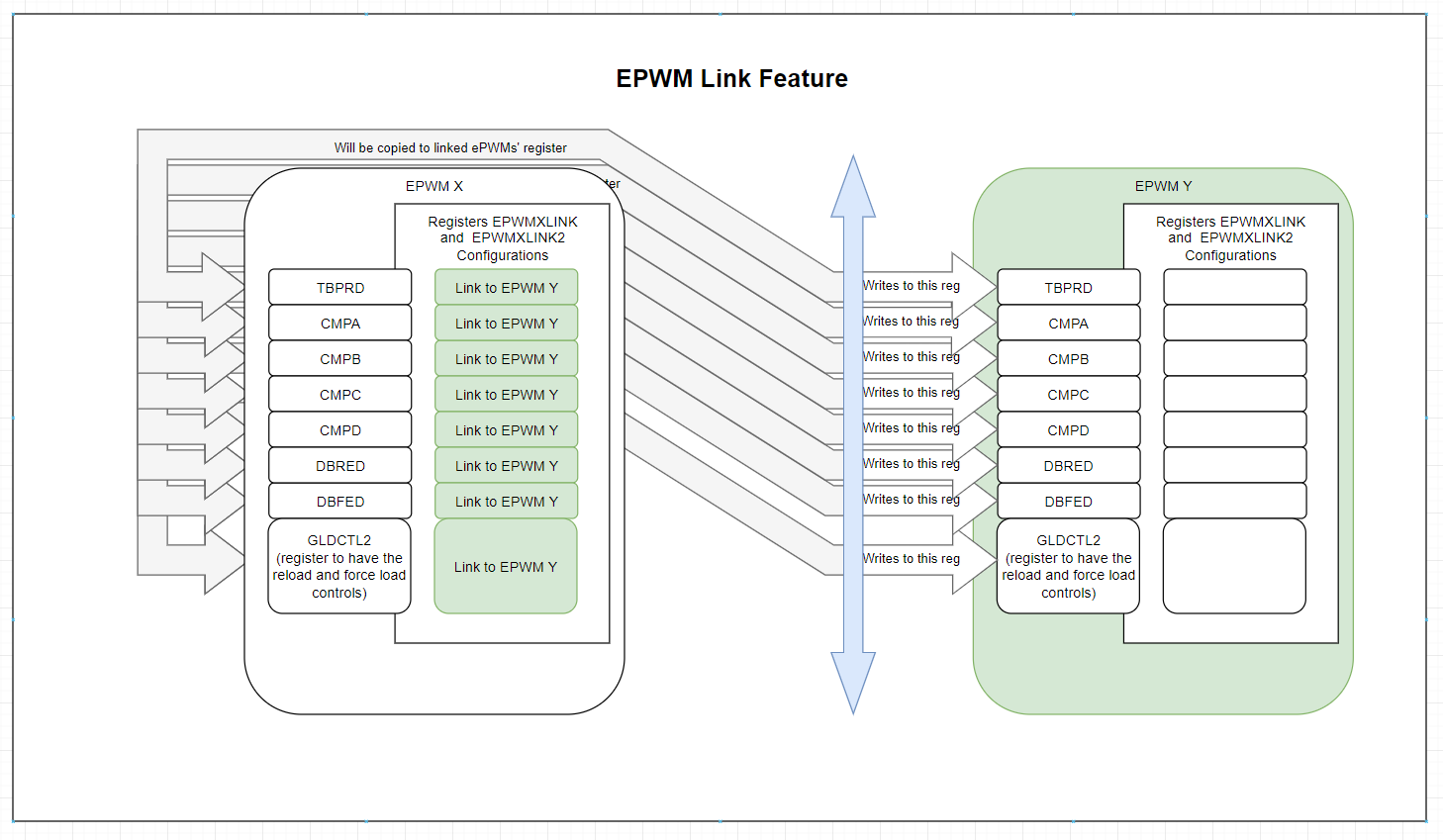 Link Feature helps link the EPWMs to have simultaneous updates to the link enabled registers like TBPRD/CMP(A/B/C/D)/DBFED/DBRED/GLDCTL2, when these registers in the linked EPWMs are written to.