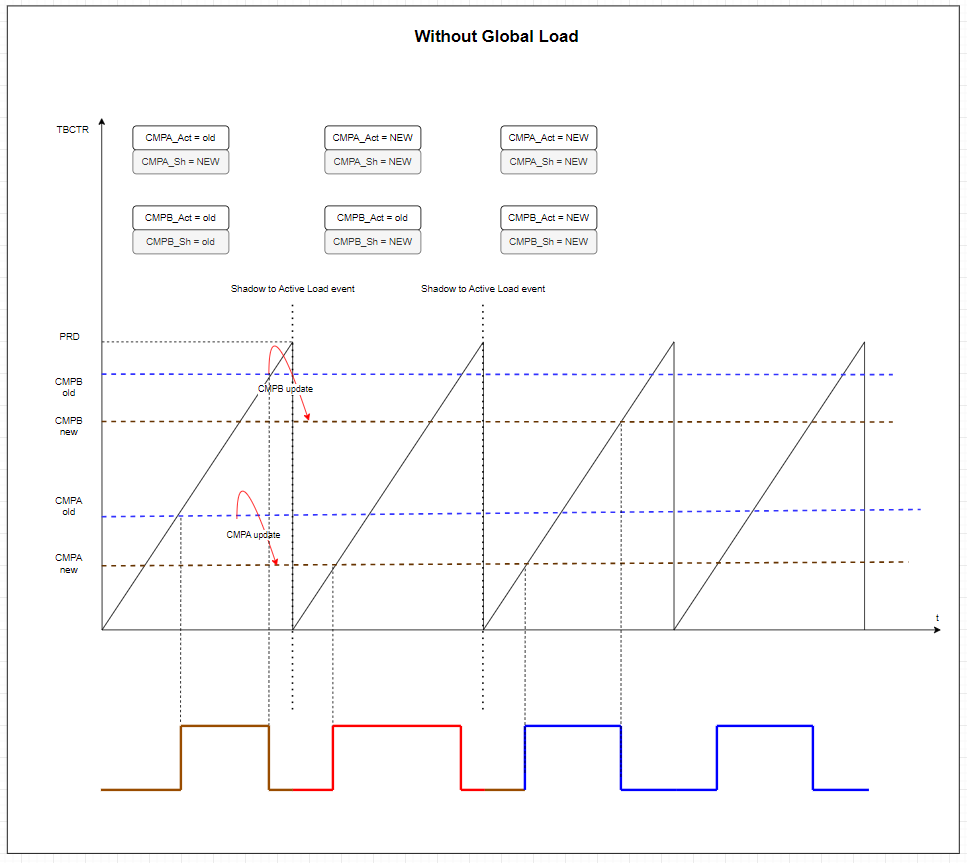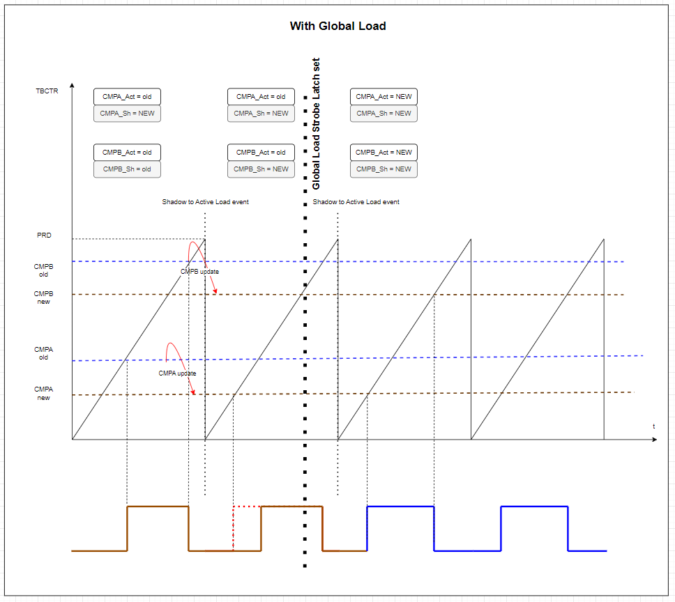 Many Applications will have EPWMs with runtime updates to their CMP/TBPRD/Action Qualifier/ DeadBand Registers etc, that affect the EPWM Outputs. Care needs to be taken while updating these registers so that there wouldn't be any incorrect/unexpected/corrupted waveforms while these updates happen. To tackle with such issues, the EPWMs have been equipped with a Global Load feature. Along with the Shadow to Active load strobe for individual register sets, there is optional Global load strobe, if enabled, overwrites the local load strobe. The global load strobe can be used for activating all shadow to active transfers, this will result in retaining the older EPWM outputs untill all the shadow registers are updated, resulting in no currupted waveforms in between.