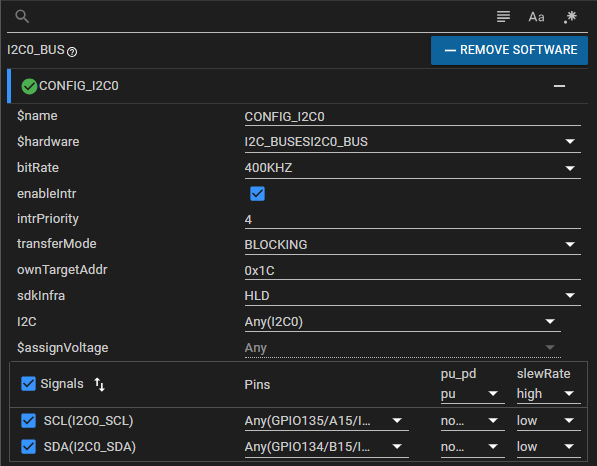 The Description window gives information about the component that would typically be found in the EVM User Guide. Once Use Software is selected, the full component driver configuration window opens, allowing direct configuration of the on-board peripheral: