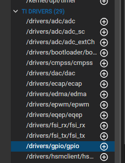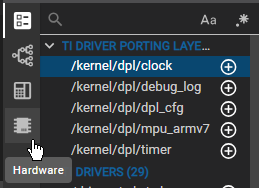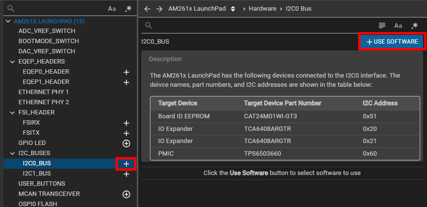 In the sidebar, on-board configurable hardware is sorted by peripheral and hardware type. Note that not all hardware is supported by software configuration using the SysConfig GUI, such as switches and buttons that must be physically manipulated.