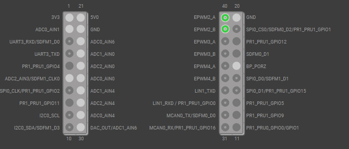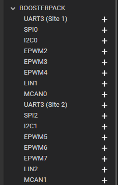 SysConfig can be used to add specific signals to their designated external header pin. Standard TI EVMs, such as LaunchPads, controlCARDs, and SOMs have standard locations on their external header interfaces for typical MCU signals, allowing for universal support of accessory boards and docking hardware.