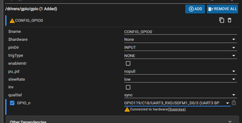 Notice that when adding GPIO119, a warning will appear. This is to alert the user that this pin is connected to on-board hardware, and can be suppressed. The EVM header GUI will change to indicate that this pin is being configured by software.