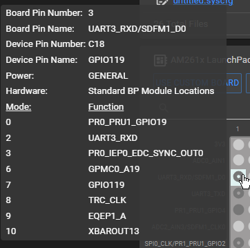 Hovering over any pin in the GUI shows all available signals via the device PinMux on any given external header. For example, hovering over BoosterPack pin 3 in the GUI for AM261x LaunchPad shows that while the pin is defined for UART3_RXD, several other signals can be accessed on this pin through the device PinMux.