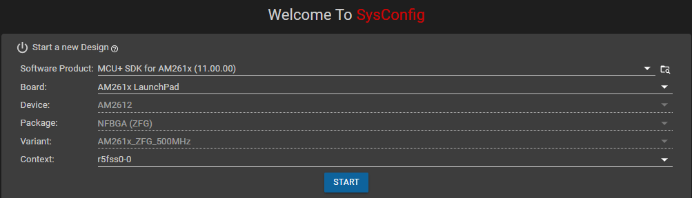 Select the desired EVM (AM261x LaunchPad will be used for this guide) and click START.