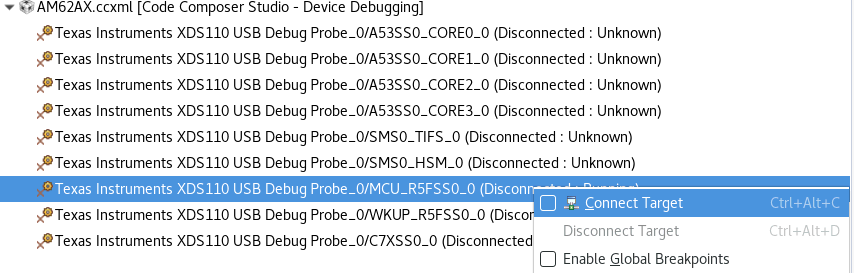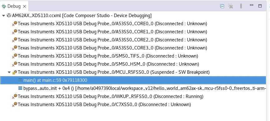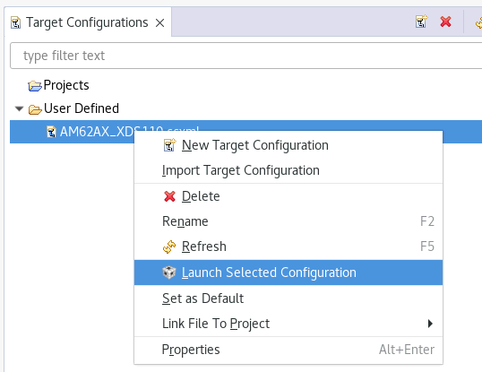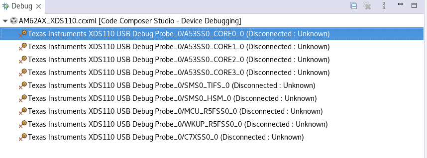 - You will see the AM62AX target configuration in the "Debug" window as shown below