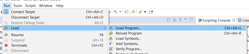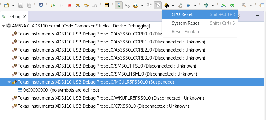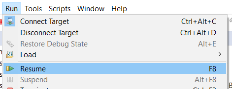 - Select "Resume" to run the program and debug using the various CCS debug options
