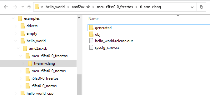 examples/{example folder}/{board}/{cpu}_{os}/{compiler} as shown below for the "hello world" program.