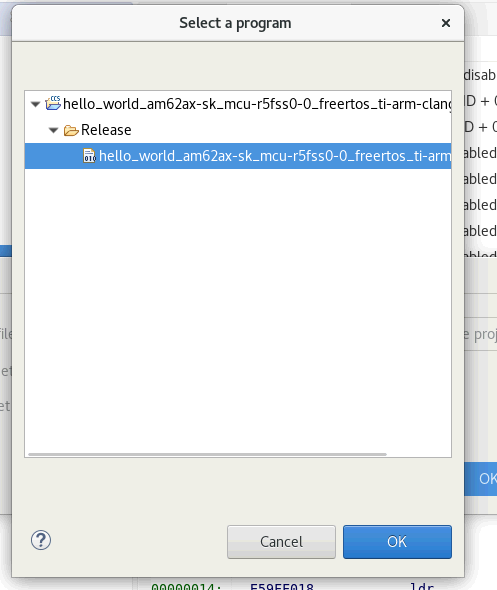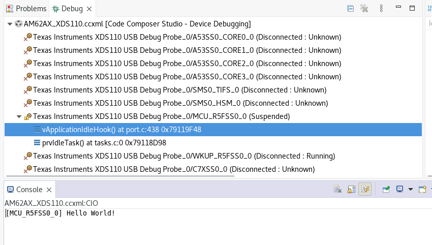 - Depending on the example you are running, you may need to load more programs on other CPUs for the example to work as expected. Typically, this is needed for multi-core interprocessor communication (IPC) examples. For the "hello world" program shown above, no more programs need to be loaded.