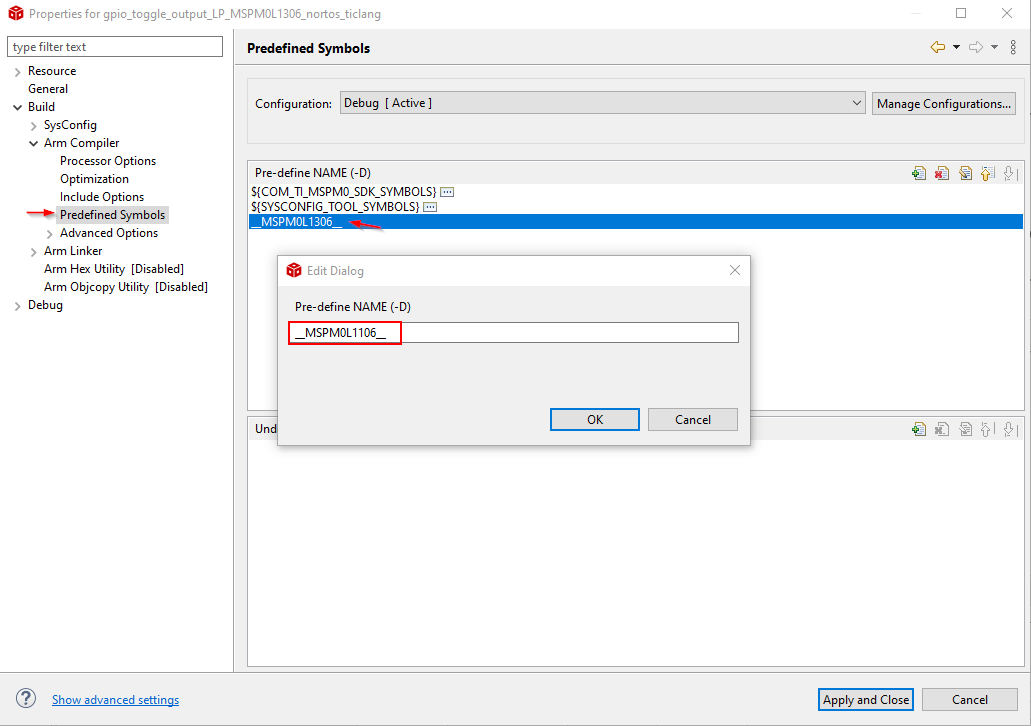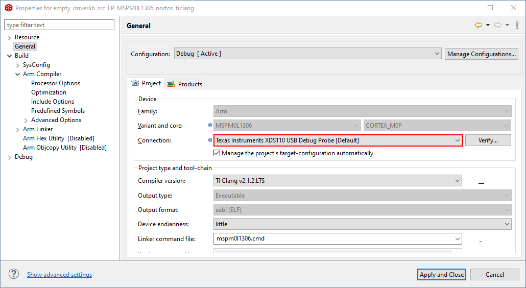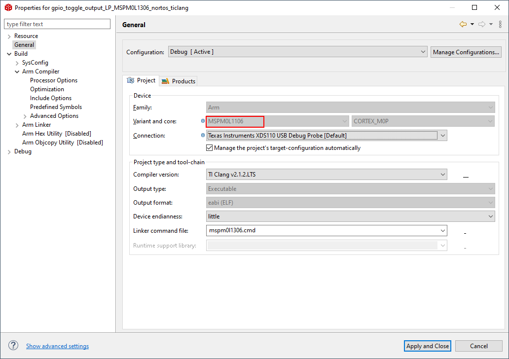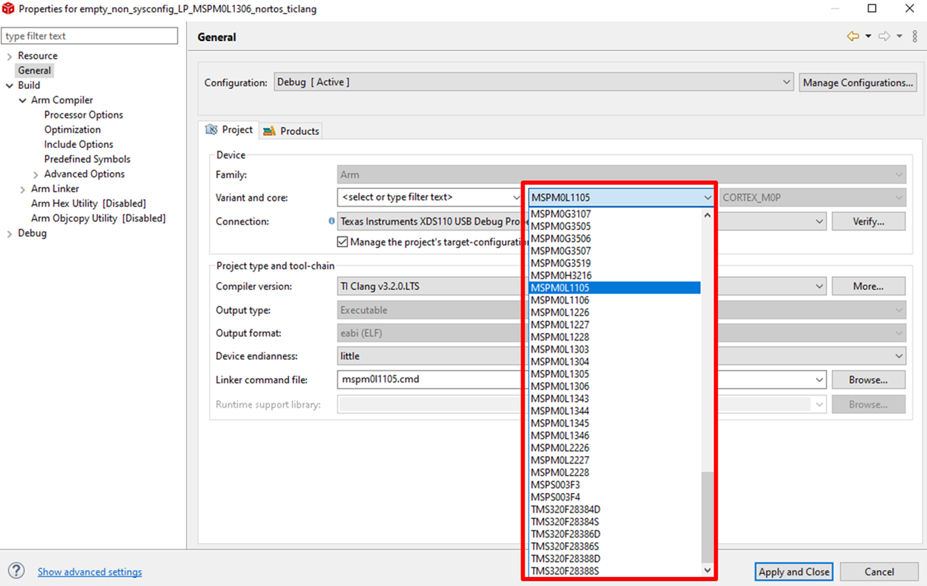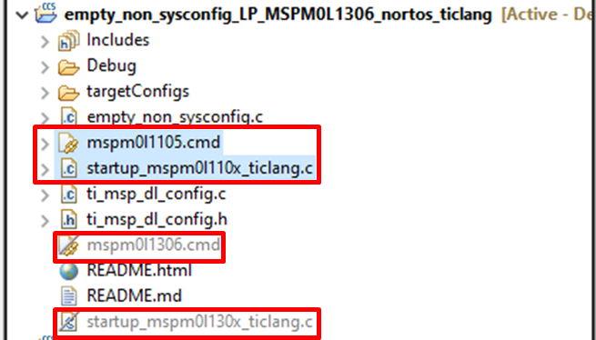 SysConfig allows for an easier migration between MSPM0 derivatives; however for some projects manual modifications are required. The steps below apply to TI Arm Clang but similar steps apply to Arm GCC.