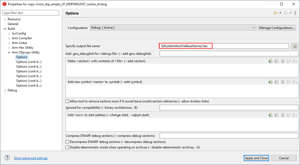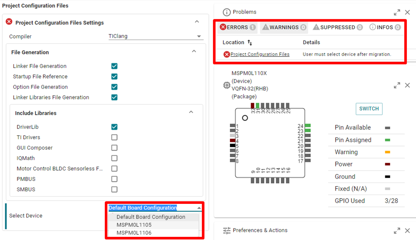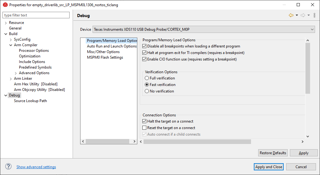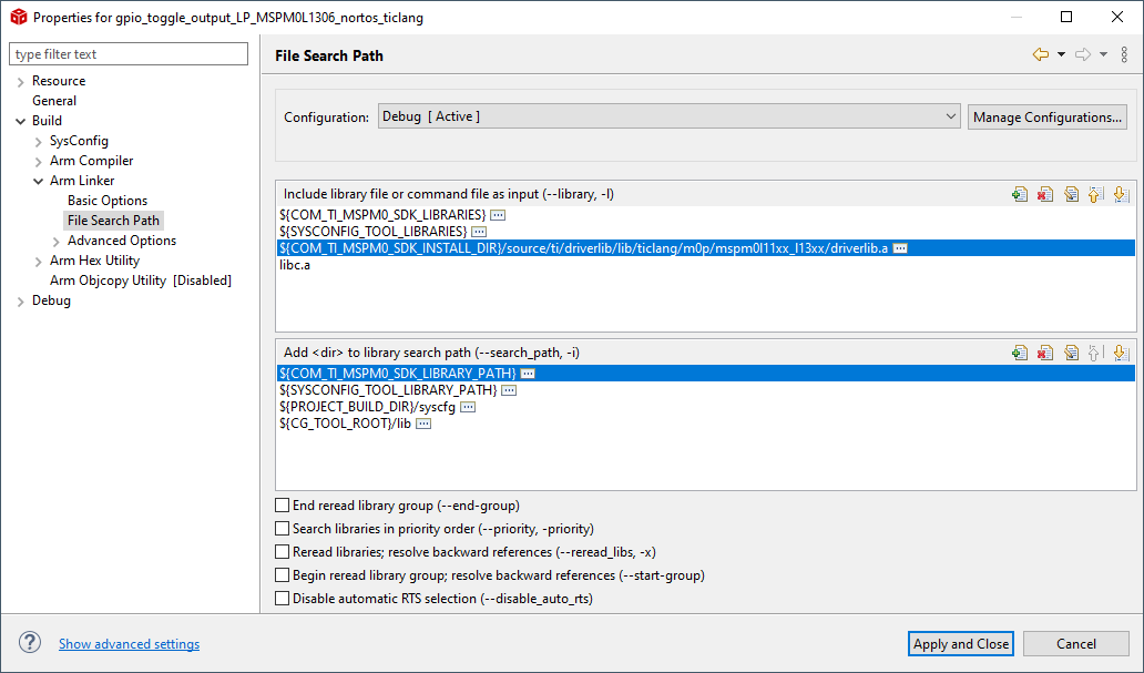 SysConfig allows for an easier migration between MSPM0 derivatives; however for some projects manual modifications are required. The steps below apply to TI Arm Clang but similar steps apply to Arm GCC.
