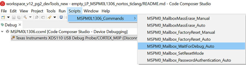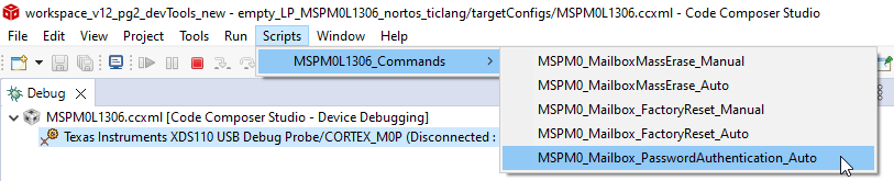 On the debugger window menu, select Scripts → MSPM0xxxx_Commands (where MSPM0xxxx depends on the current MSPM0 device), and select MSPM0_MailboxPasswordAuthentication_Auto.