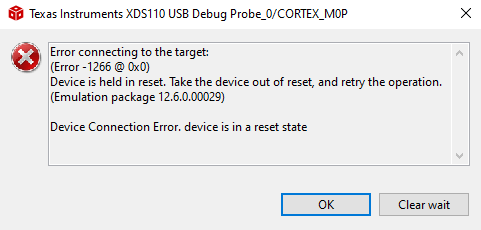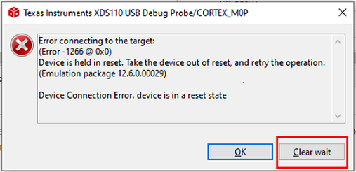 MSPM0_MailboxWaitForDebug_Auto: Wait for debug will be performed using the XDS110 reset line and asking the user to click on “clear reset” button.