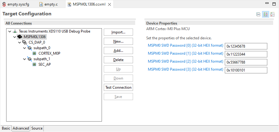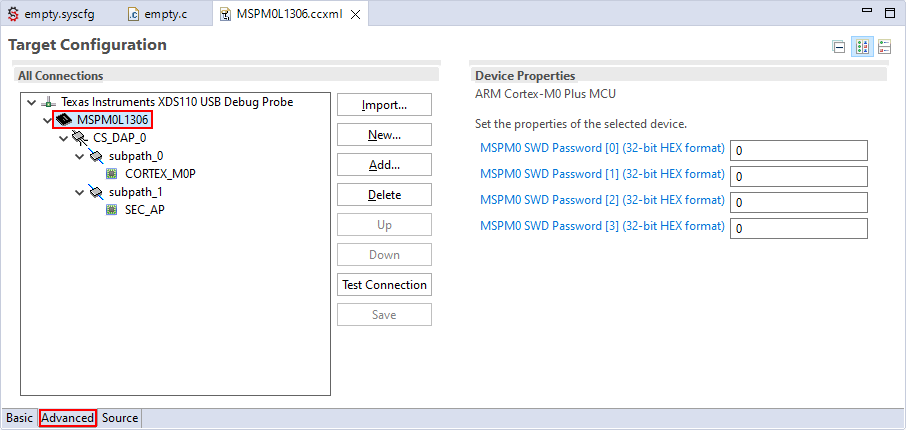 To configure the password, double-click the .ccxml inside the CCS project, go to the Advanced tab and select the MSPM0 device: