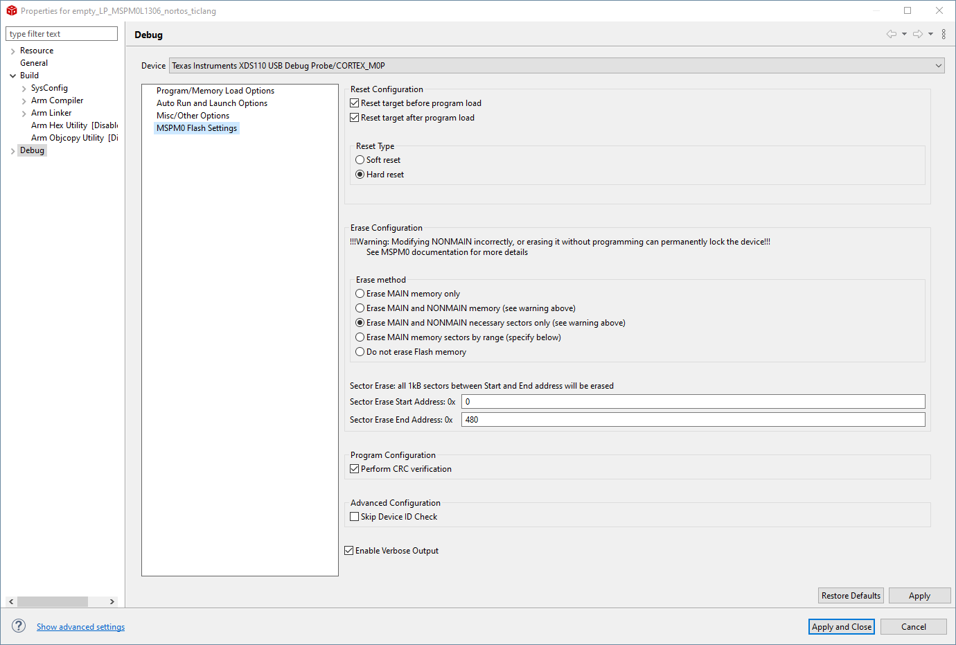 To view and modify these settings, open the project properties and select Debug → Category:MSPM0 Flash Settings.
