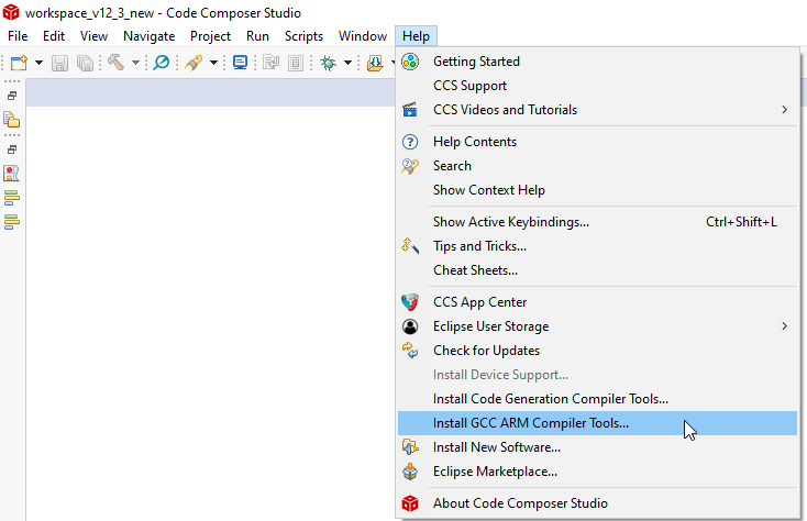 GCC can be installed by selecting Help→Install GCC ARM Compiler Tools: