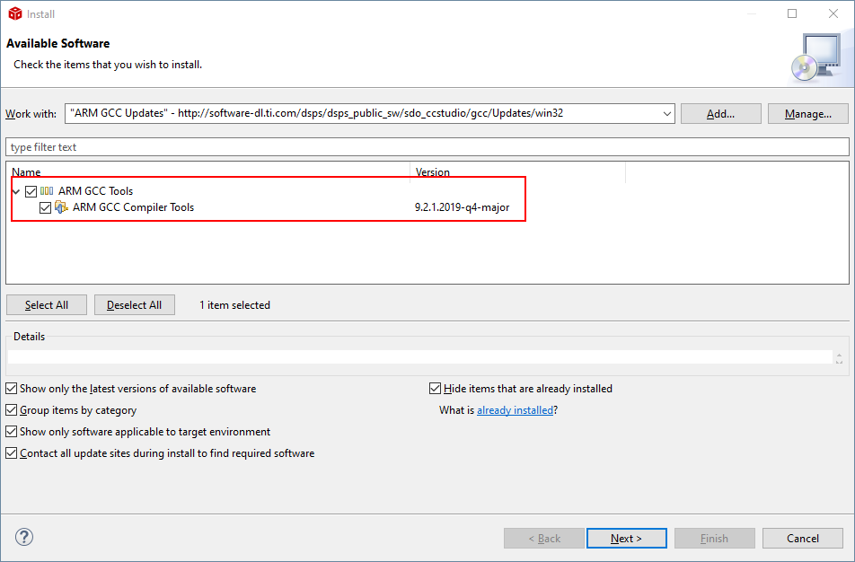 Select the version to install. CCS and the MSPM0-SDK only include and support some versions of the toolchain. Refer to release notes of your installed MSPM0-SDK version for information about the supported GCC version(s).