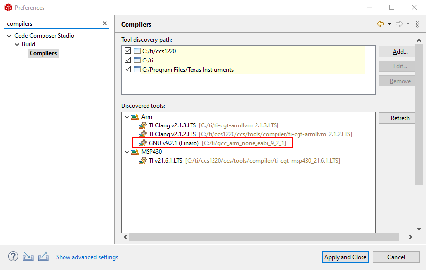 If the installation was successful, click on Window→Preferences, then Code Composer Studio→Build→Compilers to see a list of the compilers installed in CCS.
