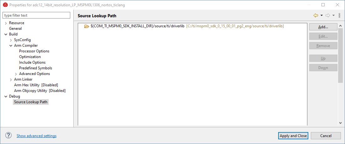 Projects might include pre-built libraries which can be difficult to debug if symbols are not available. An example of such libraries is the MSPM0 DriverLib which is used by many MSPM0 SDK examples. This issue can be fixed by adding the source code to the lookup path.