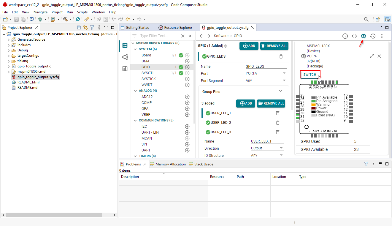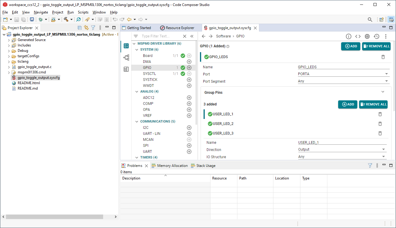Some examples in the MSPM0 SDK have SysConfig support. SysConfig is an intuitive and comprehensive collection of graphical utilities for configuring pins, peripherals, radios, subsystems, and other components. SysConfig helps you manage, expose, and resolve conflicts visually so that you have more time to create differentiated applications.