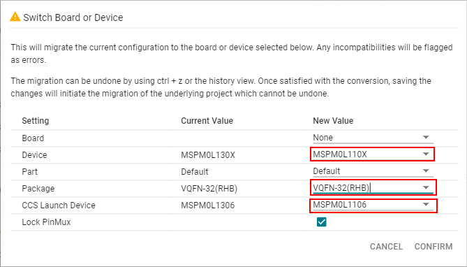 Select the New Values for the Device, Package, and CCS Launch Device to migrate the project configuration to, and then click CONFIRM.
