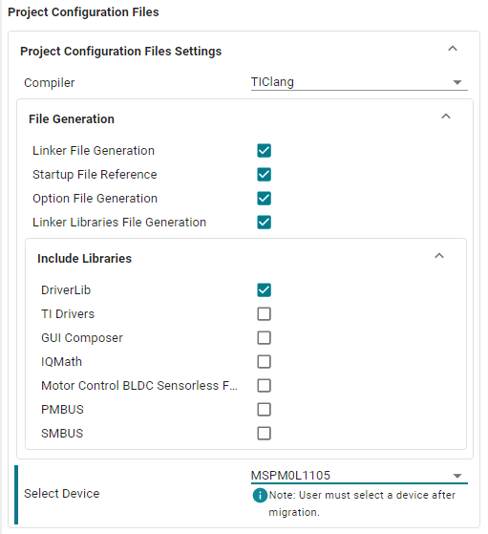 In order to migrate a project configuration to a new MSPM0 derivative (such as a new board, device, or package), the MSPM0 SDK supports several project migration processes. Project migration in this scope means updating relevant project configuration files and settings that are specific to the derivative, including linker files, startup files, and included libraries. The available options for migration depend on the project configuration, and the user should consult the desired project’s README for more information on which approach is supported. An overview of the available migration options and when they can be used are given below: - SysConfig Project Migration: This is the default approach for SysConfig compatible projects, in which all the configuration files can be handled by SysConfig. - Non-SysConfig Compatible Project Migration: This is the default approach for non-SysConfig compatible projects, where all the configuration files can be handled by the built-in device support package - Manual Migration: For all other cases that require custom projectspecs or other incompatible configurations, the user can follow these steps for manual migration.