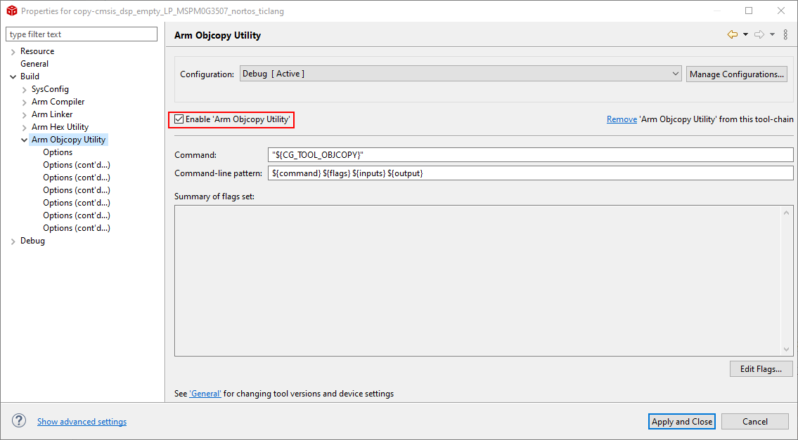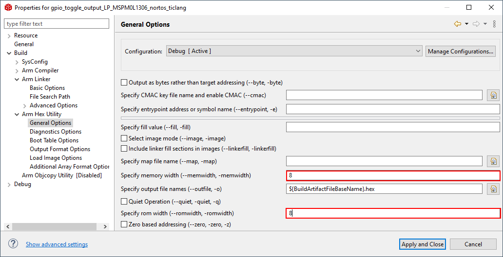 When using Intel HEX for MSPM0, select a memory and ROM width of 8 in Build → Arm Hex Utility → General Options.