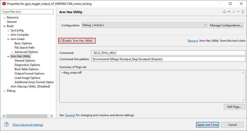 Right-click on a project and select Properties. Select Build → Arm Hex Utility and select Enable Arm Hex Utility.