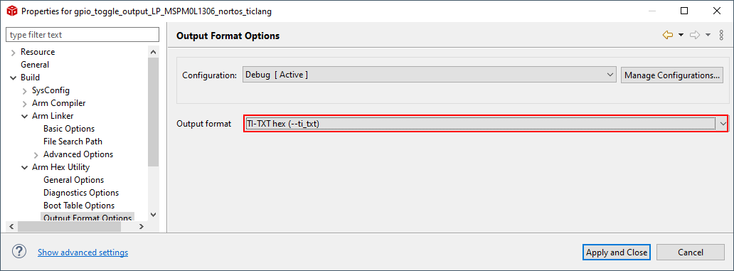 Select Output Format Options. Then select the TI-TXT hex (–ti_txt) option.