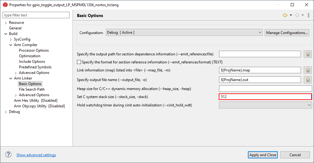 2.6.1 Configure Stack and Heap using TI Arm Clang compiler¶