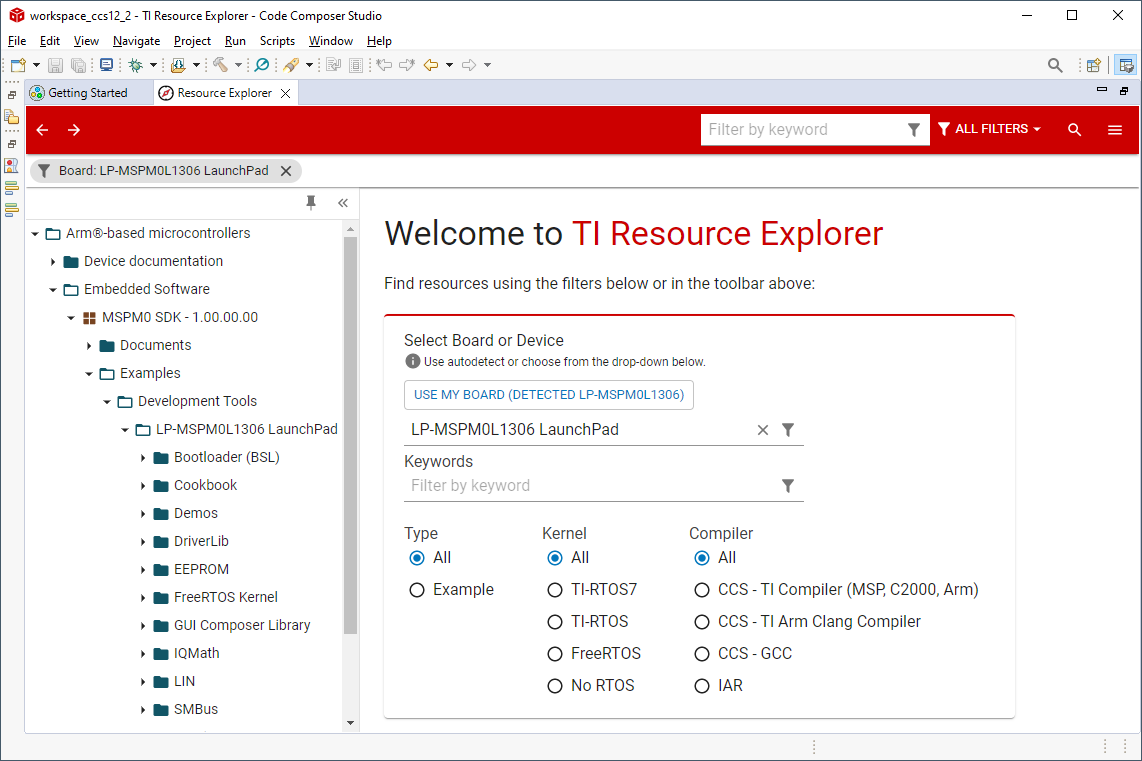Use the integrated search to filter by LaunchPad (i.e. LP-MSPM0L) device (i.e. MSPM0L), middleware (i.e. DriverLib), or solution (i.e. LIN). Note that TI-Rex will automatically detect a connected LaunchPad.