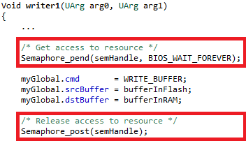 Queue_put()andQueue_get()add/remove elements from the linked list in an atomic manner. Thread-safety is guaranteed. Also note that the user's data structure provides theprevandnextpointers via theQueue_Elemfield in theirMyMsgstructure. This avoids memory allocation in the Queue module and also allows the linked list to be infinitely long (memory permitting).Semaphore Example 2: In this example, the semaphore is being treated as a mutex (MUTual EXclusion). If another task wanted to access the global structure