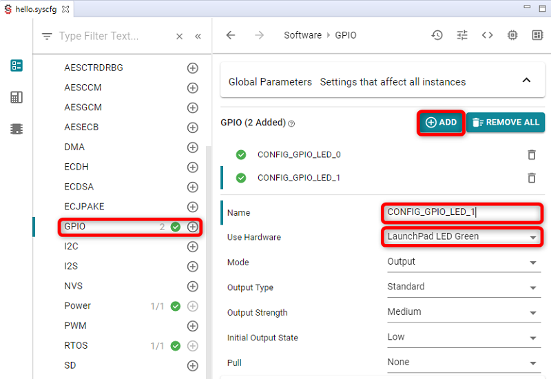 hello.cfgand enable the kernel's logging feature. Note: this is turned on in the debug TI-RTOS kernel configuration project used by the driver examples.