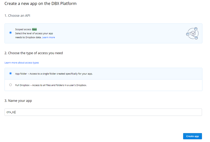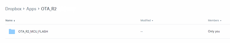 Navigate to your Dropbox files Home → Apps → your newly created apps folder. In this folder, create a directory OTA_R2_MCU_FLASH. This is the directory where we will put the OTA image file (in the next task).